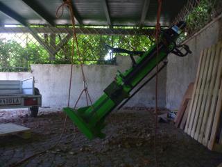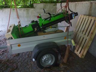 Hab den Spalter mit meinem kleinen Anhänger aus Mödling geholt. Da habe immerhin drei Mann und ein Hubstapler daran gearbeitet, das Gerät aufzuladen und umzulegen - aufrecht stehend transportieren war jetzt eher keine Option. Daheim war die Frage, wie ich ihn wieder von dem Anhänger runterkriege.
