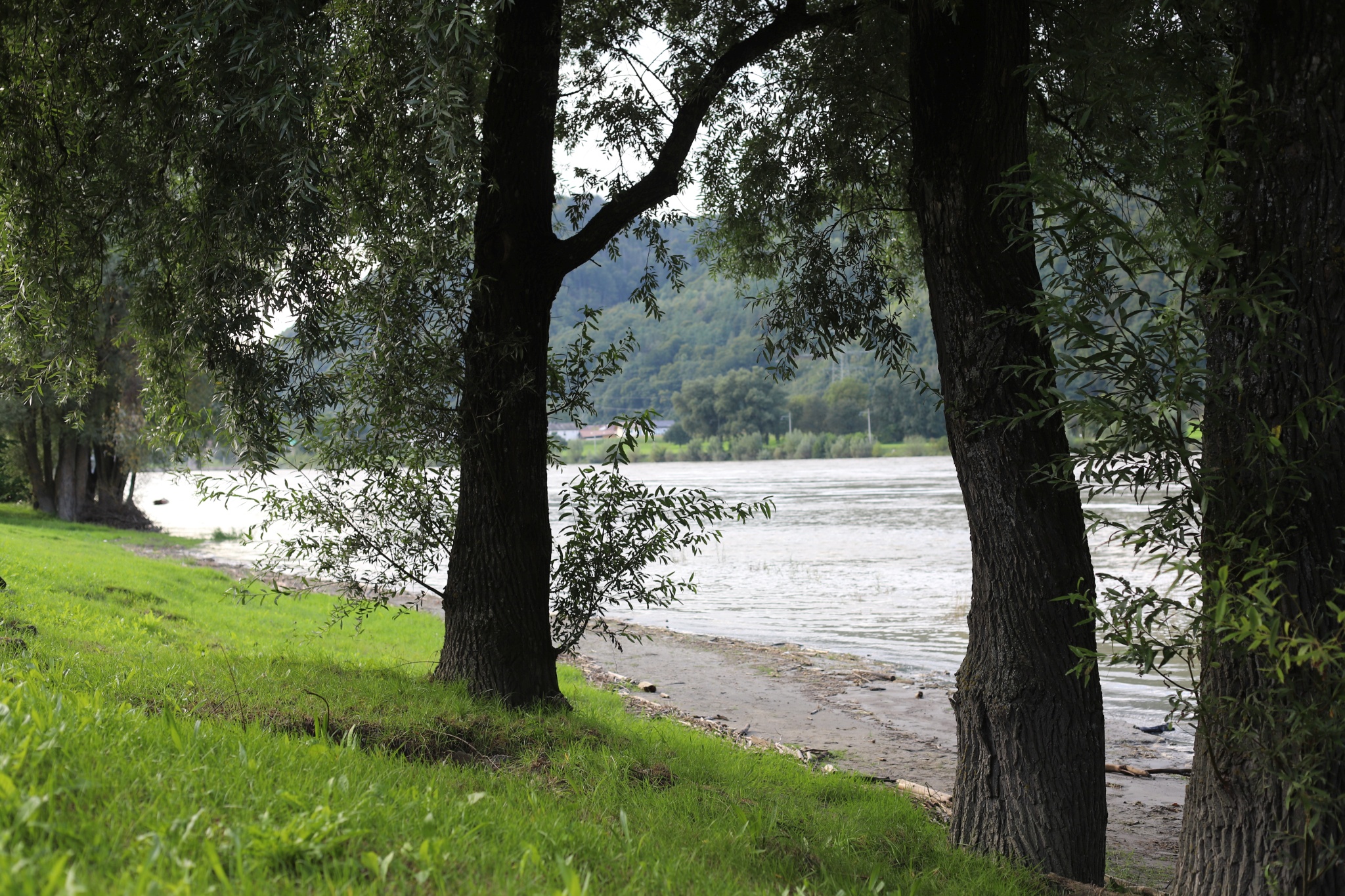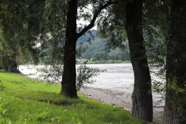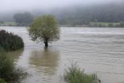 Donautal ist hier sehr schön, hoher Pegelstand, einige Bäume steh'n im Wasser.