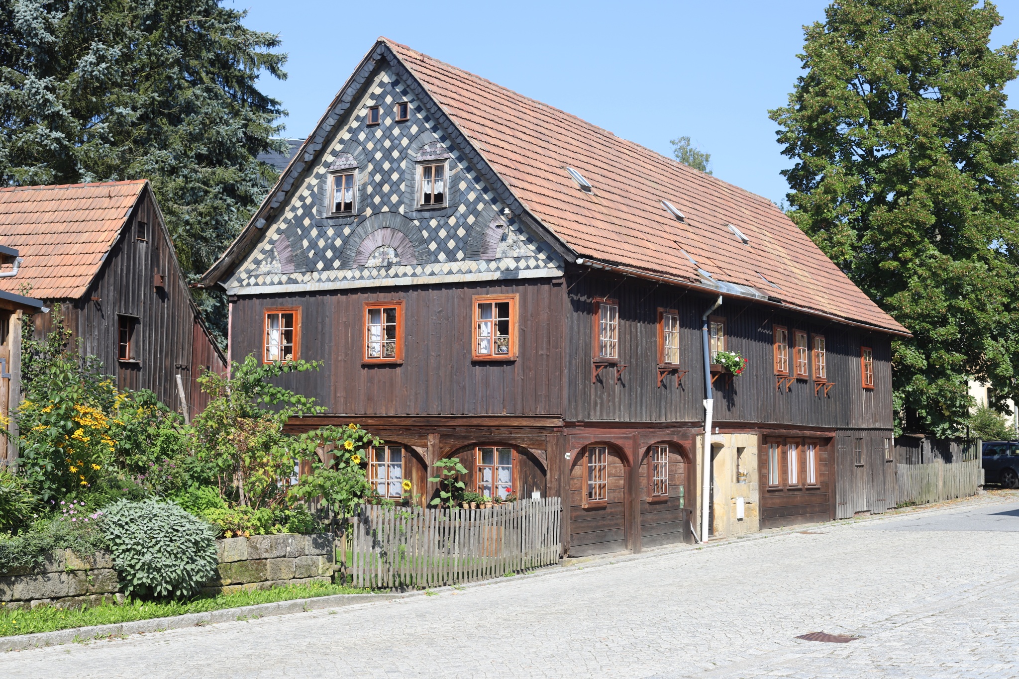 Im Kirnitzschtal fährt eine Trambahn. Das Holzhaus ist ein "Umgebindehaus", der erste Stock und das Dach ruhen auf eigenen Stützen und nicht auf dem Erdgeschoß; man glaubt heute, die Bauweise wurde entwickelt, damit das Haus unabhängiger vom Trockenschrumpfen verschiedener Hölzer ist. - Auf der Elbe gibt es reichlich Ausflugsfahrten, man kann bis in die Tschechei.