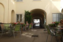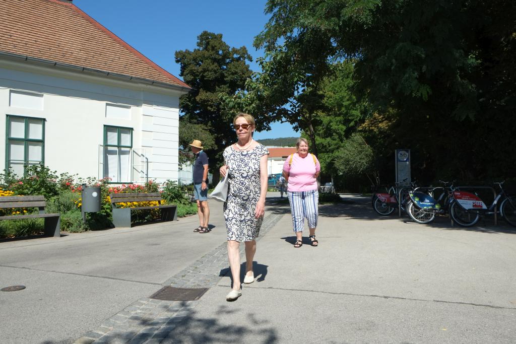 Es ist immer noch sehhhr heiß! - An einen Wien-Besuch gar nicht zu denken. Wir frühstückten gemütlich um 9:00 Uhr (die Zeit haben wir all die Tage beibehalten) und machten uns dann so gegen zehn auf einen Rundgang durch Baden. Bergab durch die Marchetstraße, vorbei an der „alten Schwimmschule“ - heute Römertherme - führte uns unser Weg zum „Grünen Markt“, wo das Kaffee Trahbüchler schon sehr einladend winkte, was wir uns aber noch verkniffen haben. Durch die Fußgängerzone, vorbei am Beethovenhaus, gelangten wir dann zum Hauptplatz mit Rathaus und der Marien- (Pest-)Säule, zur Frauenkirche (wurde wegen der Schwefelquelle unter dem Altar seinerzeit verlegt - heute Frauenbad, Rainer-Museum) und schließlich ins Kaffeehaus im Kaishaus; Kaffee für Brigitte und Bier für Brigitte ;-) im Schatten im Innenhof. In der Mittagshitze war es schon bemühend, durch die Pfarrgasse (Jubiläumsstadttheater, Batzenhäusel, etc.) bis zur Stadtpfarrkirche St. Stephan zu marschieren. Dort, wo Mozarts Uraufführung seines „AVE VERUM“ stattgefunden hatte. In der Pfarrkirche St. Stephan mit Paul Trogers Gemälde der Steinigung des Stephan (ebenfalls darauf ein Selbstbildnis Trogers) umfing uns angenehme, erleichternde Kühle. Hermann kehrte schnell zu Fuß zurück nach Hause, um das Auto zu holen, damit wir uns nicht mehr bergauf in die Mozartstraße quälen mussten. Also warteten Brigitte, Michael und ich beim Kurpark-Eingang vis à vis vom Badener Spielcasino mit dem Springbrunnen. Wieder daheim in der Mozartstraße, labten wir uns an