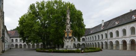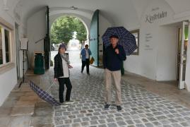 Durch das dicht bewaldete Helenental entlang der Schwechat kamen wir - auf kurvenreicher Strecke - nach ca. 20 Minuten an unser Ziel. Der zeitweise starke Regen behindert die Besichtigung erheblich. Wir rutschen geduckt zwischen den Regentropfen durch den Innenhof, gerade noch die Mariensäule - ein Pendant zur „Pestsäule“ am Badener Hauptplatz -, die alten, mächtigen Platanen betrachtet und ein Kurzbesuch in der einfachen, mystischen, romanischen Kirche angeschlossen.