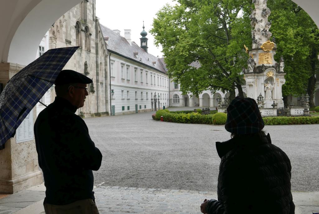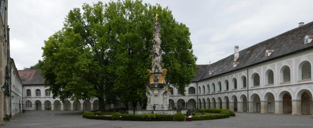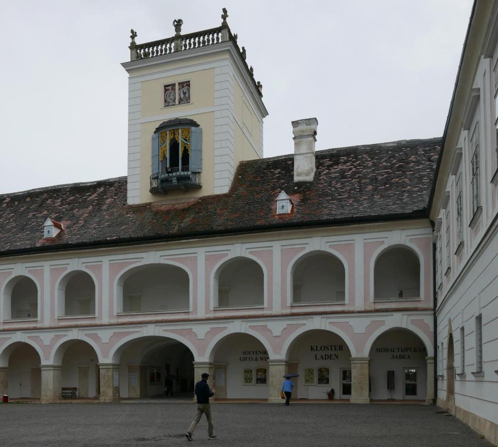 Ausflug zum Stift Heiligenkreuz im Wiener Wald. Nicht mehr so heiß. Regnerisch. Kulinarisch kein Erfolg, Michaels Essen versalzen.