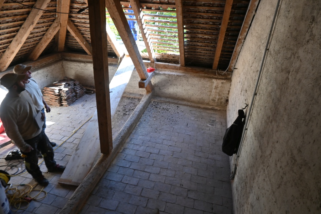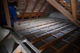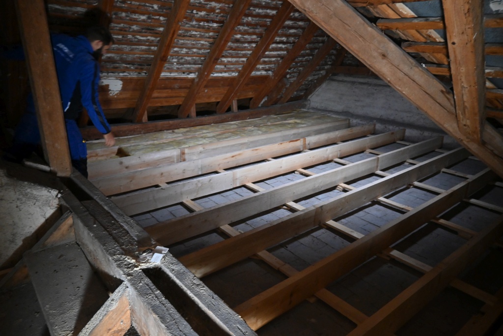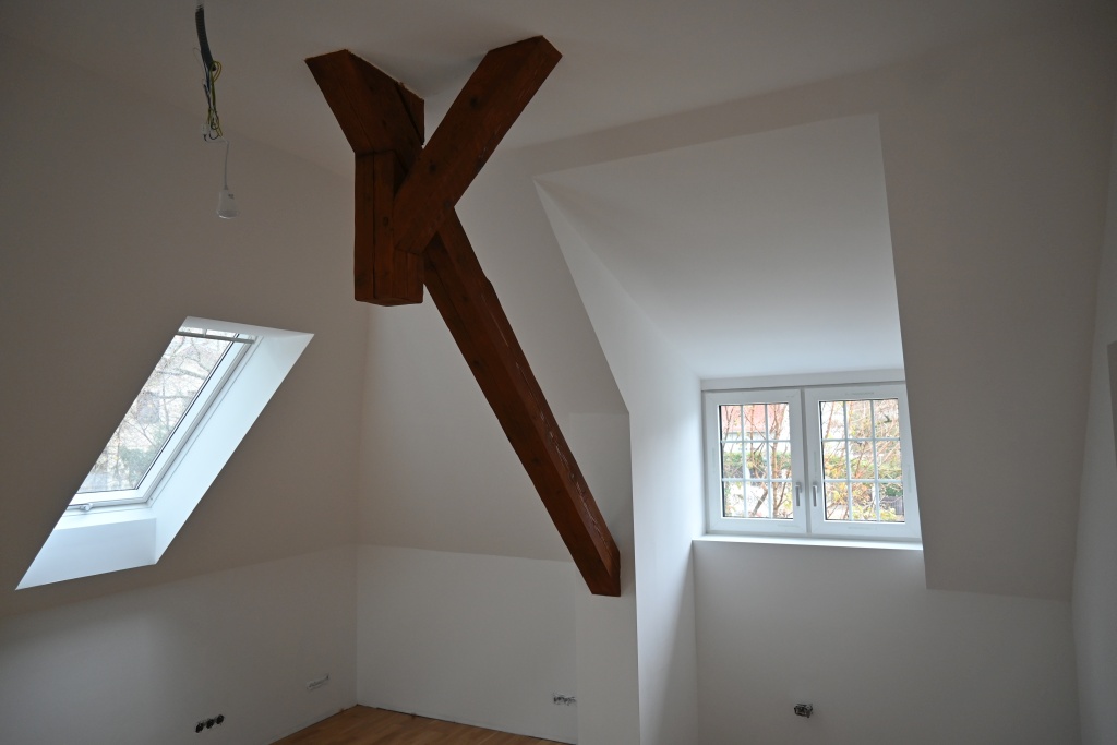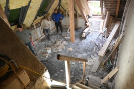 Es wird der Dachboden-Boden isoliert, ein Dachbodenraum ausgebaut und mit einer bestehenden Wohnung verbunden.