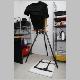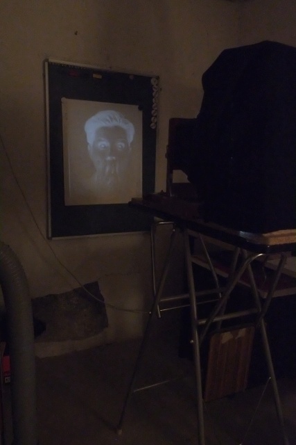 Habe die Iston als einen improvisierten Horizontalvergrößerer adaptiert; mit einer Pressspanplatte als Unterlage auf einen Dia-Projektionstisch gestellt; an der Wand eine Magnetplatte montiert; auf der wird das Photopapier mit Magneten festgehalten. Das Ausrichten ist ein bisschen umständlich, aber es geht. Als Objektv verwende ich das 300 mm. Bei Blende 22 und einer nur geringen Vergrößerung auf 24x30 ergab sich eine Belichtungszeit von 28 Sekunden; Verschluss auf "B", gemessen mit Hama Laborwecker. Das Kentmere Papier ohne Multigradefilter wird eher hart. Die Ausleuchtung mit der (Negativbetrachtungs-) Leuchtplatte passt dz. noch nicht.