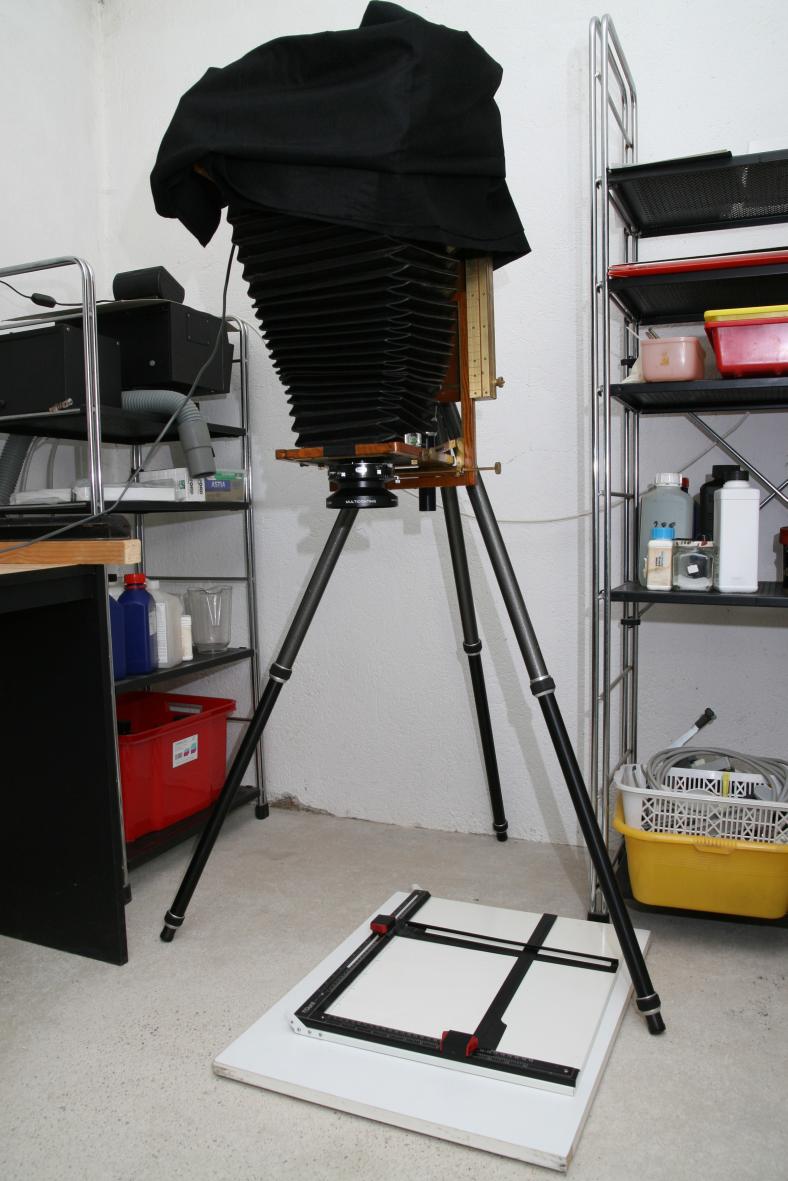 Die Kamera montierte ich auf das stärkste Stativ, das ich habe, und richtete sie senkrecht nach unten. Der Rahmen, der Mattscheibe und Planfilmkassetten hält, wurde abgenommen. Das Negativ habe ich auf eine Glasplatte geklebt, so dass es sich auf der Seite zum Objektiv hin befindet und mit der Schichtseite ebenfalls zum Objektiv schaut. Oben drauf habe ich eine Leuchtplatte gelegt, wie man sie zum Kontrollieren von Negativen und Dias verwendet. Die Platte hat zwei Leuchtröhren hinter einer Milchglasscheibe. Das seitlich und oben austretende Licht habe ich abgefangen, indem ich mehrere Lagen schwarzen Filzes herumtrapierte.