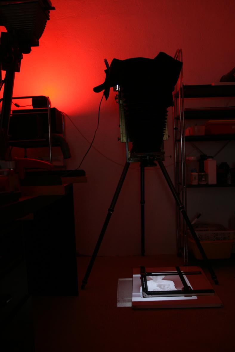 Es ist keine neue Idee, eine 4x5 oder 8x10 Kamera auch zum Vergroessern der damit aufgenommenen Negative zu verwenden. Zur Linhof 4x5 gibt es oder gab es zumindest einen Kaltlichtansatz. Vor längerer Zeit wurde vorgebracht, man solle ein Bild genau mit dem Objektiv vergroessern, mit dem man es aufgenommen hat. Dadurch würden sich Fehler bezüglich des Lichtabfalls am Rand und in den Ecken aufheben. Inzwischen ist man der Meinung, dass sich zum Vergroessern ein spezielles Vergroesserungobjektiv besser eignet, weil es für die flache Vorlage (eben das Negativ) optimiert ist.